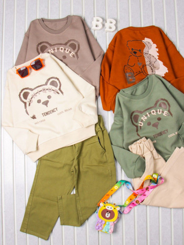بلوزپنبه طرح چاپ خرس نشسته با شلوار کتان اسپرت مناسب برای یک سال تا سه سال